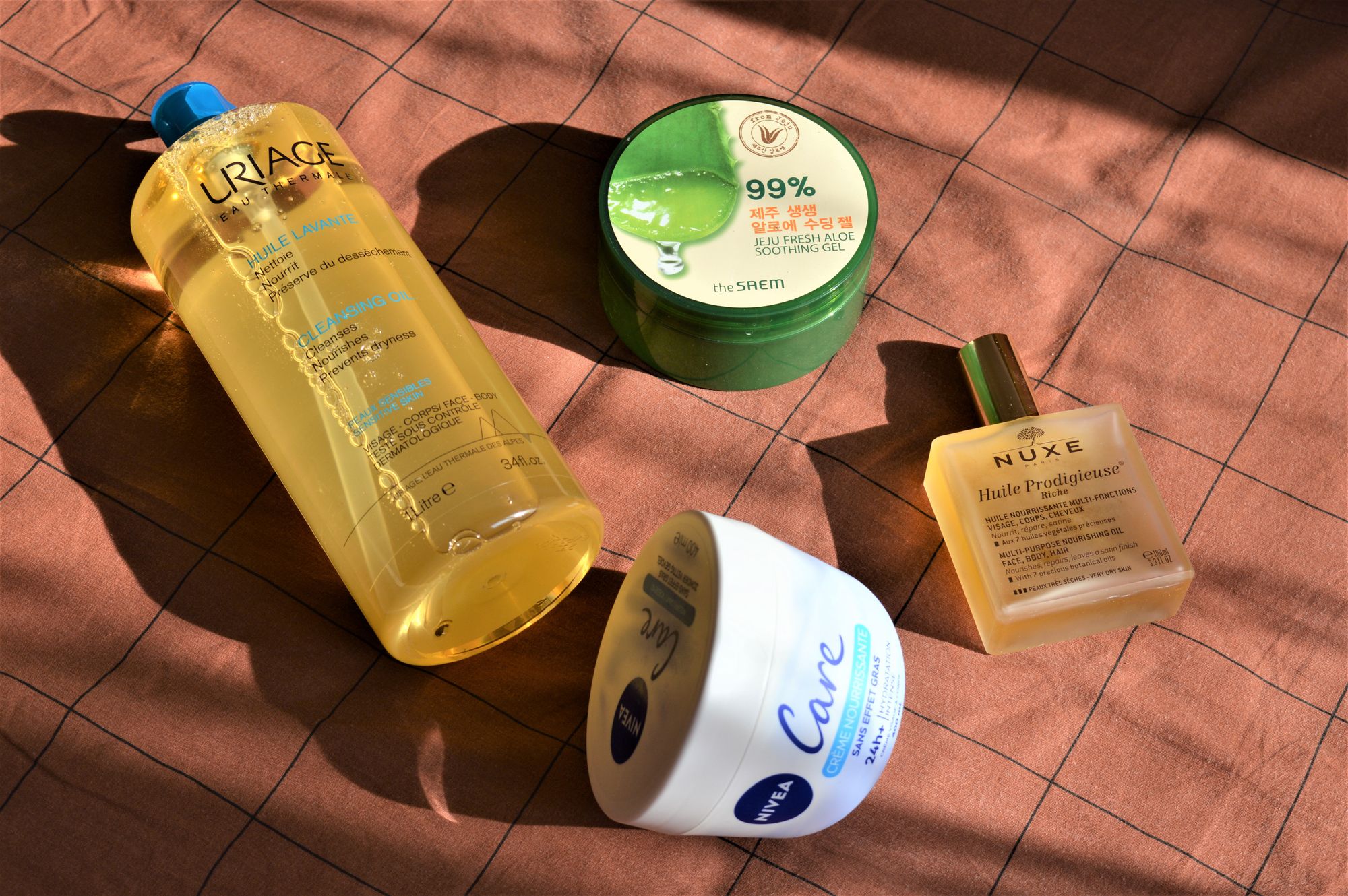 - Face: Facial skincare is similar to body skincare, however, I prefer not to use a too greasy cream on my face unless it is necessary. After showering or washing my face, I immediately apply a layer of aloe vera gel on my face and neck, gently massaging it to help the skin absorb the hydration. Once a week, I also apply a facial mask made of equal amounts of aloe vera gel and "Nuxe huile prodigieuse." I find that it keeps my facial skin softer, and I love the scent of that prodigious oil!